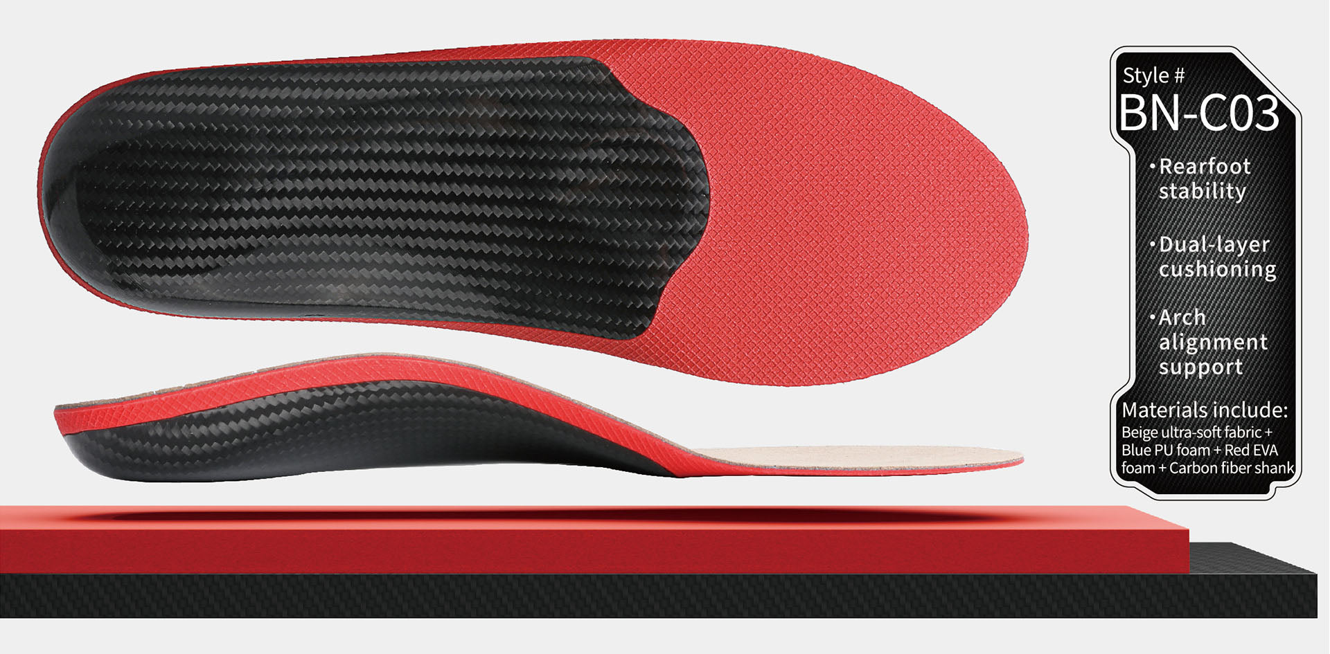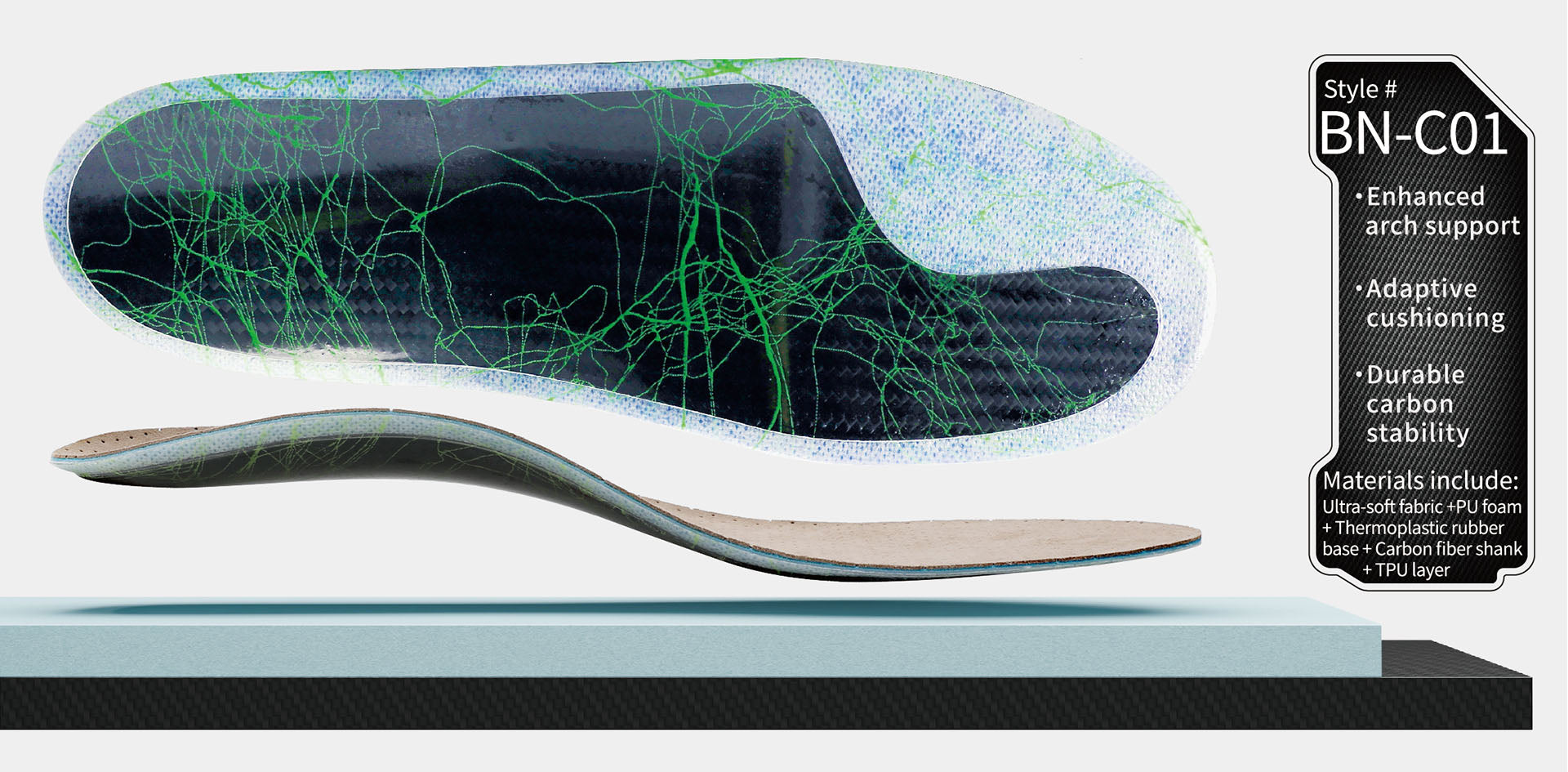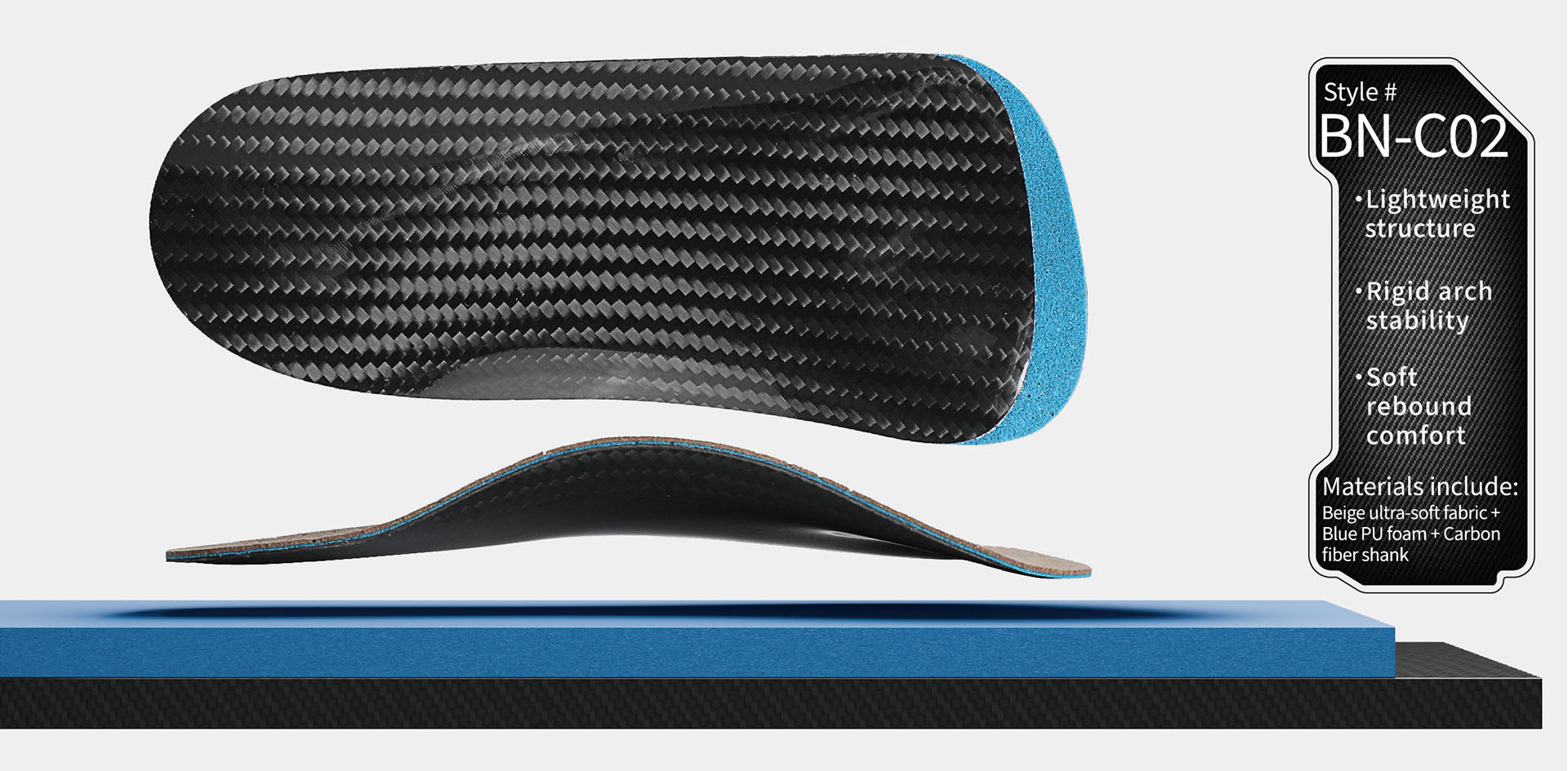 A minimalist carbon-fiber insole offering ightweight rigidity and precise arch contro. PU foam delivers soft rebound and comfort, while the carbon shank enhances stability for daily wear or mild sports activities.